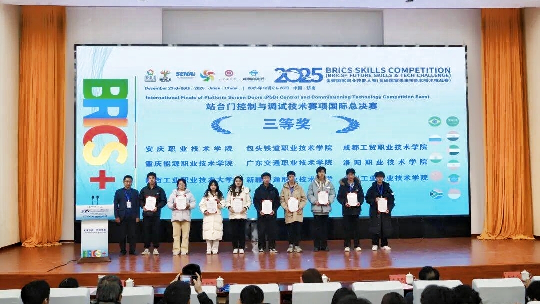12月22日至26日,2025金磚國家職業(yè)技能大賽站臺門控制與調(diào)試技術(shù)賽項(xiàng)國際總決賽在山東職業(yè)學(xué)院舉行。安慶職業(yè)技術(shù)學(xué)院機(jī)電工程學(xué)院李陶勝、王淑芳兩位老師指導(dǎo)馮術(shù)鵬、張宇航兩位學(xué)生獲得三等獎。