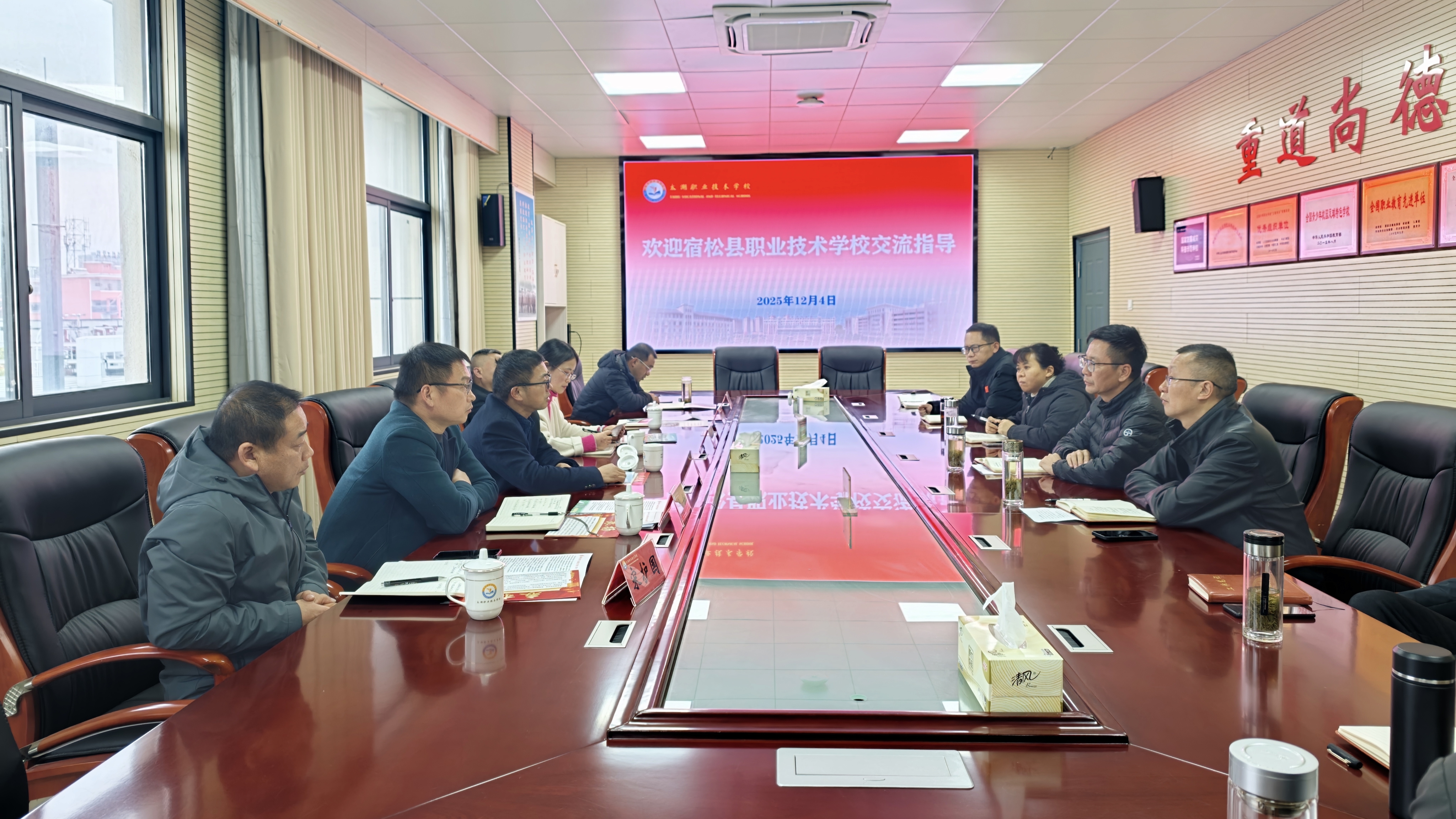 12月4日,宿松縣職業(yè)技術學校黨支部書記、校長鄧勝榮率領調(diào)研團隊一行6人來訪我校,圍繞專業(yè)建設、辦學層次提升、教學管理、校企合作等核心議題開展專題調(diào)研交流。我校班子成員及相關職能部門負責人參與接待,雙方通過座談研討與實地參觀,展開深入交流,凝聚發(fā)展共識。